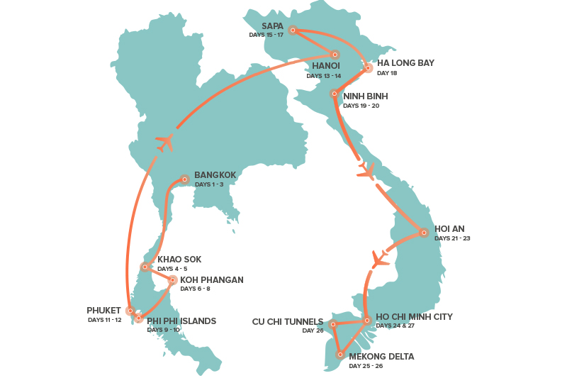 In 27 days, you'll explore the best of Thailand and Vietnam in style. From Bangkok to Ho Chi Minh City, you'll experience crazy cities and temples, discover lush jungles, party under the stars, visit the tropical Phi Phi Islands, meet rescued elephants in a sanctuary, sail around the magical Ha Long Bay, cycle through rural villages, be enchanted by Hoi An, learn about the Vietnam War, indulge in rooftop bars and that's just the tip of the iceberg.