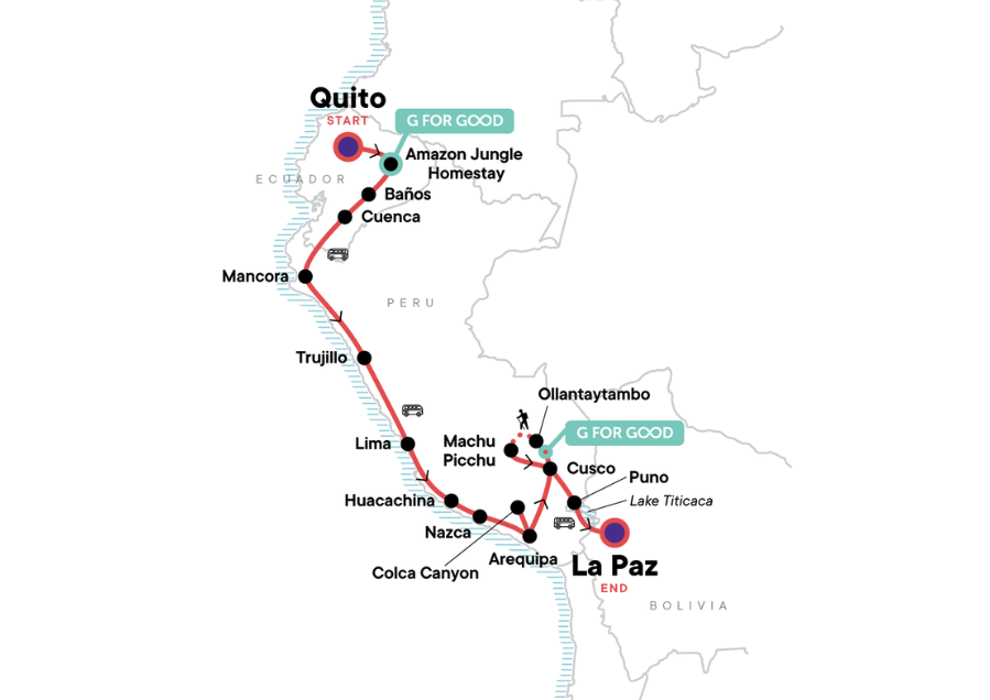 Erlebe das wahre Südamerika bei dieser fünfwöchigen Erlebnisreise durch Ecuador, Peru und Bolivien. Dieses Abenteuer bietet alles – die Pazifikküste, den atemberaubenden Amazonas und die archäologischen und kulturellen Highlights des Andenhochlands. Du wanderst auf dem Inka oder Lares Trail nach Machu Picchu und hast dazu noch viele Chancen bei Radtouren, beim Raften oder bei anderen optionalen Ausflügen, dich richtig auszutoben. Eine authentische Erfahrung durch Fahrten mit öffentlichen Verkehrsmitteln und landestypischen Unterkünften, eine Reihe von Aktivitäten sowie Zeit zur freien Verfügung, um auf eigene Faust auf Entdeckungsreise zu gehen. Diese Reise bietet alles!