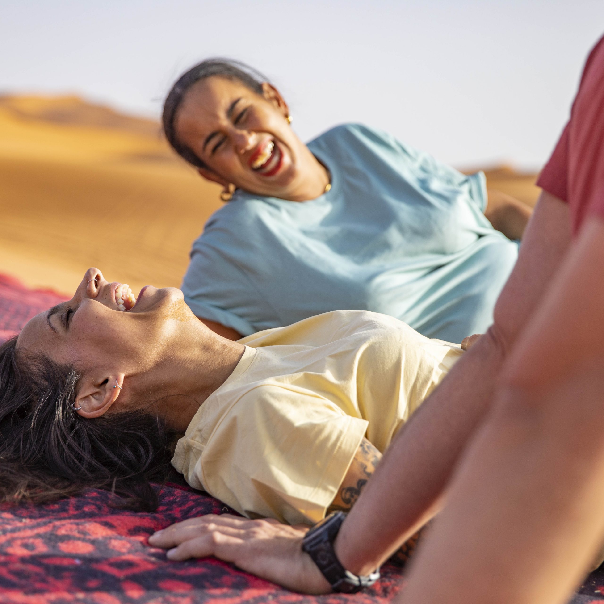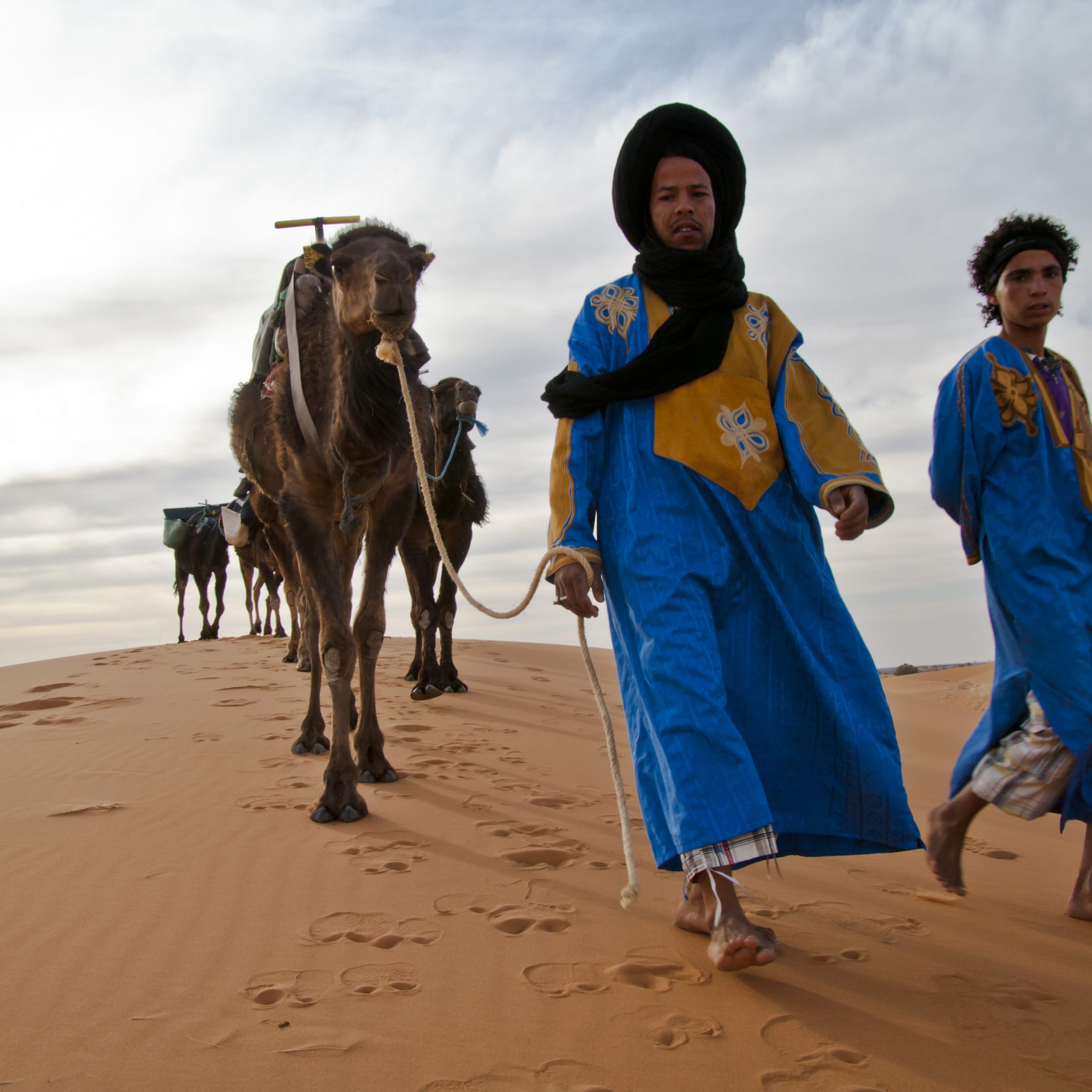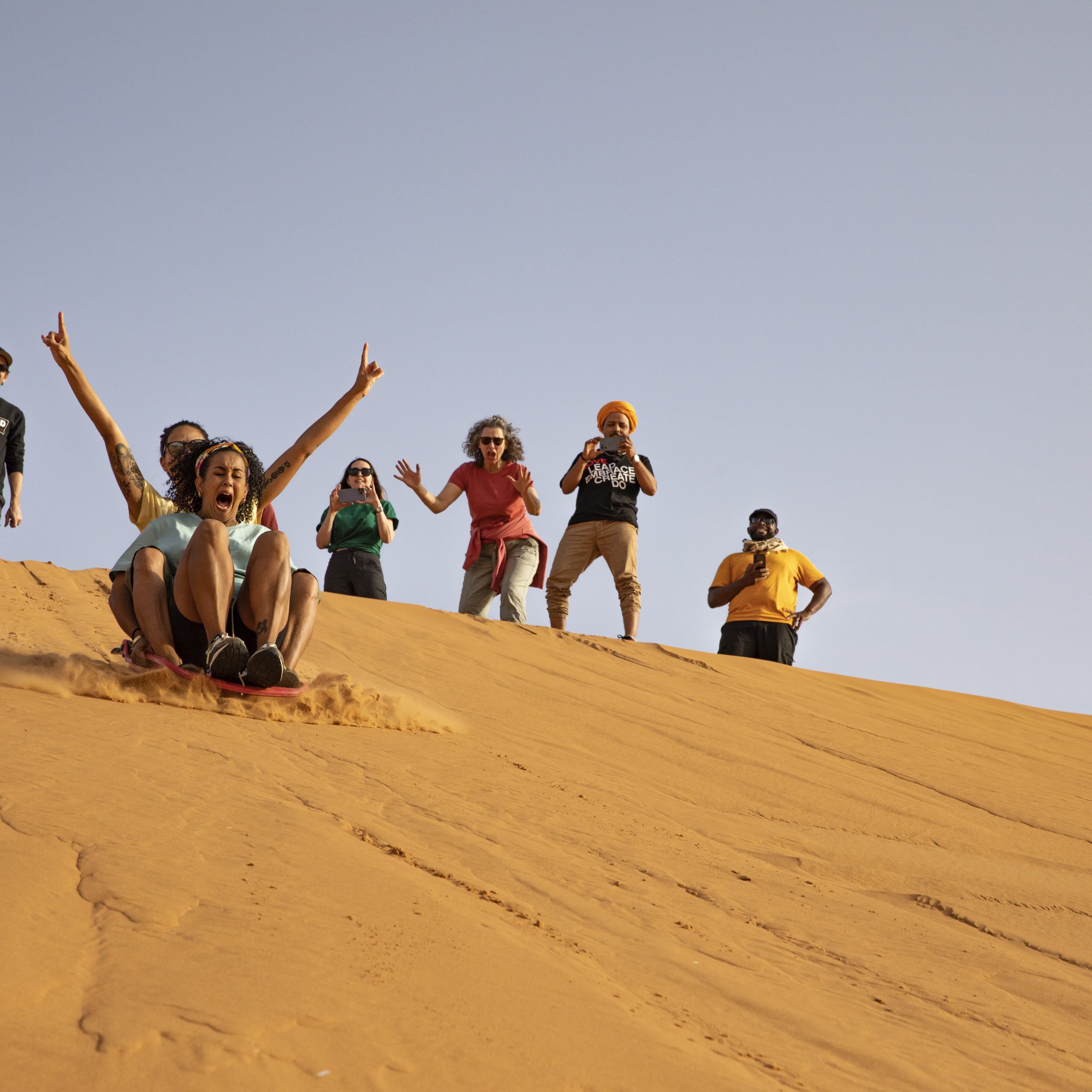 Du wachst zu einem spektakulären Sonnenaufgang in der Wüste auf und startest nach dem Frühstück in den zweiten Tag deines Sahara-Abenteuers. Heute hast du die Wahl, einen Teil der Strecke zu Fuß oder auf einem Kamel zurückzulegen und die Wüste auf besonders ursprüngliche Weise zu erleben. Nach dem Mittagessen geht es per Allradwagen weiter zur Oase Bertam. Dort erwartet dich pünktlich zum Sonnenuntergang ein weiteres Wüstenlager mit Abendessen, Geschichten und Musik am Lagerfeuer.