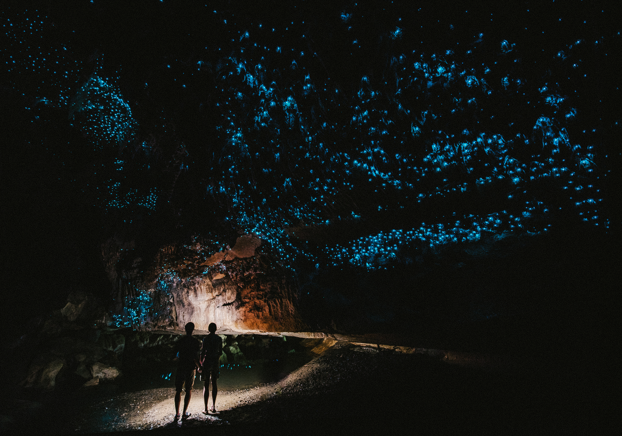 Es ist unser erster ganzer Tag auf Tour und er ist sagenhaft! Wir stehen früh auf, wie es die Kiwis tun, und machen uns auf den Weg nach Waitomo. Waitomo ist ein kleines Dorf, das etwas mehr als zwei Stunden von Auckland entfernt liegt, und es ist berühmt für sein verrücktes unterirdisches Höhlensystem. Diese Höhlen sind nicht irgendwelche Höhlen, es sind GLÜHWURMHÖHLEN! Es ist wie in einem Disney-Film: Die Höhlen sind die Heimat von Tausenden von Glühwürmchen, die in den gesamten Höhlen leuchten und glitzern. Danach machen wir uns auf den Weg zu unserem nächsten Stopp: Hobbiton. Nach einem Picknick unterwegs (es gibt *Natur*) kommen wir auf diesem 14 Hektar großen, familiengeführten Bauernhof an, der heute auf der ganzen Welt dafür bekannt ist, Teil der Kulisse für eine der bekanntesten Filmreihen aller Zeiten zu sein. Nach einem Nachmittag voller Erkundungen machen wir uns wieder auf den Weg nach Rotorua. Unsere Herberge hier ist supercool – wenn ihr gerne klettert, werdet ihr euch hier wahnsinnig wohlfühlen!