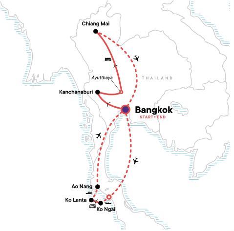 Wenn du ebenso gern am Strand liegst wie fremde Kulturen entdeckst, ist dieser Trip durch Thailand genau das Richtige für dich! Die 14-tägige Erlebnisreise führt dich von der dynamischen Metropole Bangkok und den belebten Straßen von Chiang Mai zu den paradiesischen Inseln im Süden des Landes. Unterwegs hast du reichlich Zeit, um die Unterwasserwelt beim Schnorcheln zu erkunden, Fotos von spektakulären Karstfelsen zu machen oder an weißen Sandstränden zu entspannen.