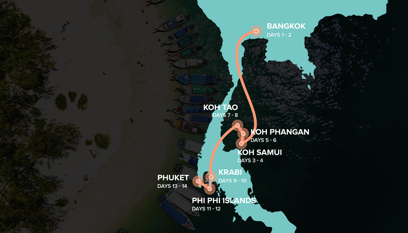 Mach dich bereit für den ultimativen Tropenurlaub: 14 Tage lang sonnenverwöhnte Strände, lebendige Kultur und nonstop gute Laune auf den schönsten Inseln Thailands.