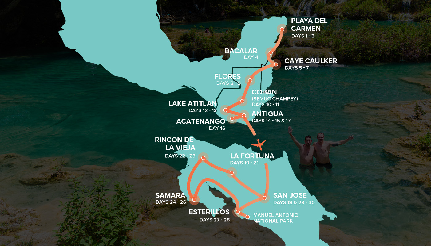Macht euch bereit für ein episches Abenteuer mitten in Mittelamerika! Brodelnde Vulkane, das zweitgrößte Barriereriff der Welt voller bunter Meeresbewohner und die faszinierende Welt der Maya-Kulturen warten auf euch. In 30 Tagen erkunden wir Mexiko, Belize, Guatemala und Costa Rica – und es wird garantiert unvergesslich. Tauche ab in beeindruckende Unterwasserwelten, staune über die uralten Pyramiden, die mitten aus dem Dschungel ragen, und erklimme die Gipfel eines Vulkans. Natürlich erwarten dich auch ein paar echte Insider-Erlebnisse, fernab der typischen Touristenpfade.